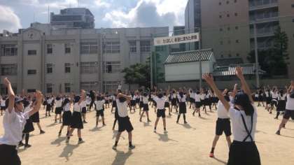 今日は、体育朝会がありました。ラジオ体操をして、体を動かしました。また、ボールの投げ方をタオルを使って練習しました。