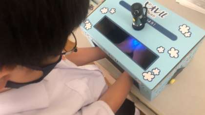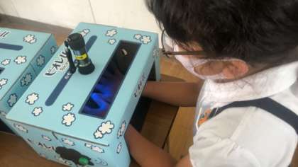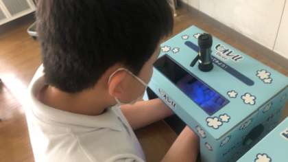 自分の手洗いがきちんとできているか、手を石鹸で洗ったあと、手をブラックライトに当てて汚れを確認しました。