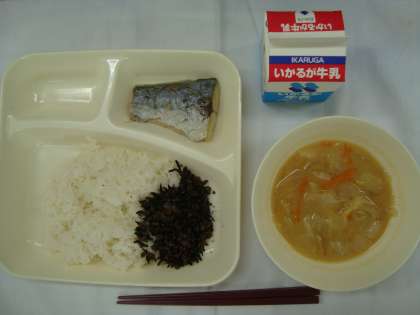 「さごしの塩焼き みそ汁 牛ひじきそぼろ ごはん 牛乳」