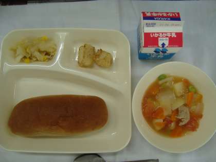 「いかてんぷら フレッシュトマトのスープ煮 サワーソテー 黒糖パン 牛乳」