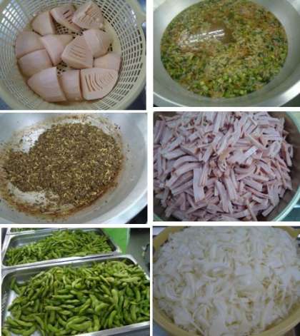「チンジャオニューロウスー ハムと野菜の中華スープ 枝豆 ごはん 牛乳」