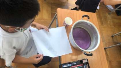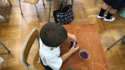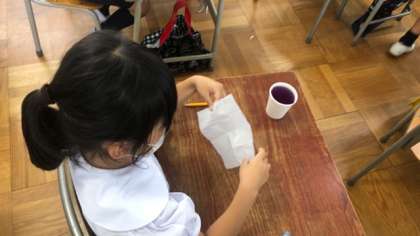 今日は、朝顔の花を水につけて、色を出しました。そして、その色づいた水に紙を浸しました。