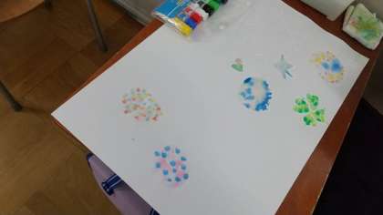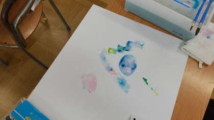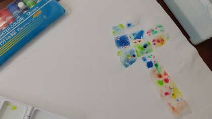先ほど、パスで書いた模様の中に水たまりをつくり、そこに絵の具を入れて、模様ができました。