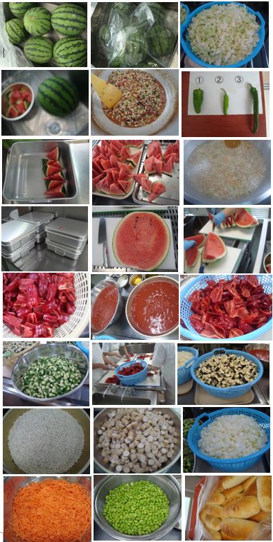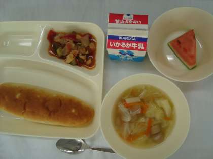 「鶏肉と夏野菜のソテー 押麦のスープ すいか おさつパン 牛乳」