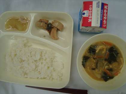 「さけのつけ焼き みそ汁 とうがんの煮もの ごはん牛乳」