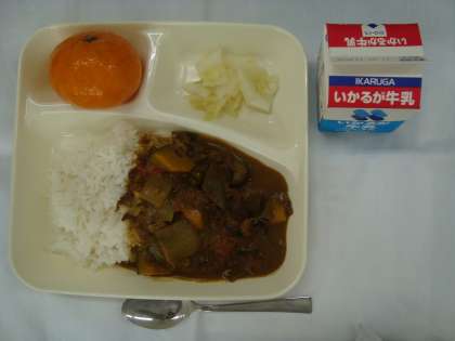 「夏野菜のカレーライス キャベツのサラダ 冷とうみかん 牛乳」