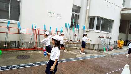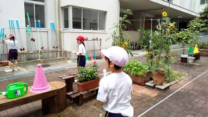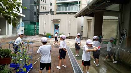 今日は、生活科の授業のなかで、水鉄砲を使って水遊びをしました。
