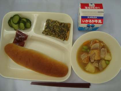 「もずく入りヒラヤーチー 豚肉とあつあげの煮もの あっさりきゅうり パン 牛乳」