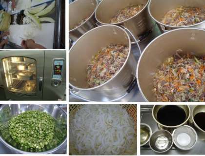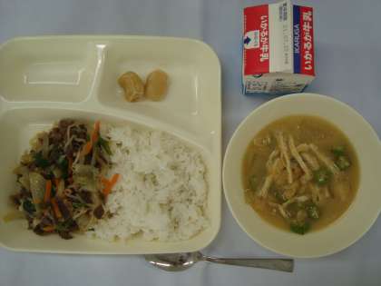 「牛丼 とうがんのみそ汁 白花豆の煮もの 牛乳」