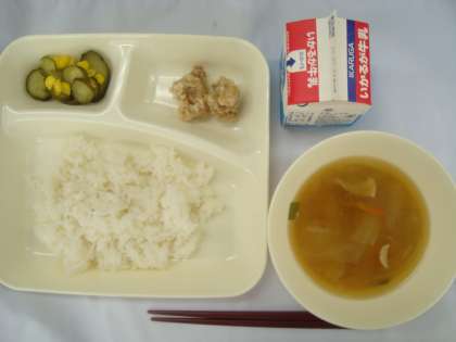 「鶏肉のからあげ 中華みそスープ きゅうりとコーンの甘酢あえ ごはん 牛乳」