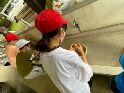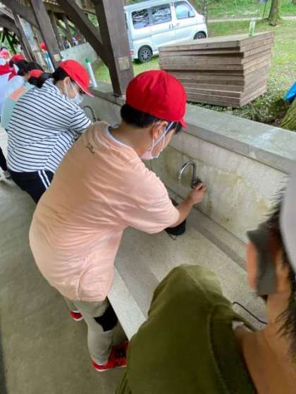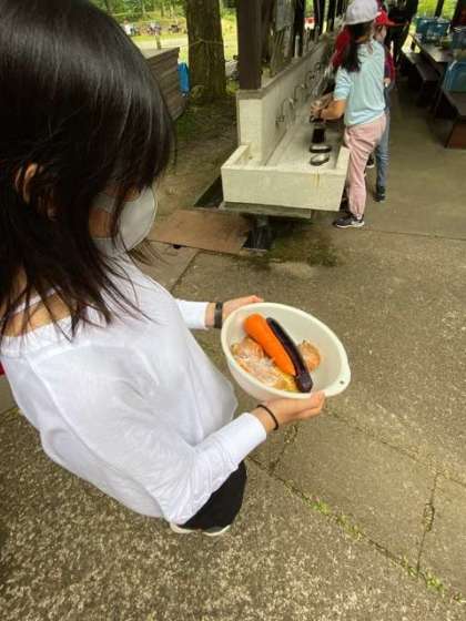 飯盒の中にお米を入れて洗ったり、野菜を洗ったりしています。