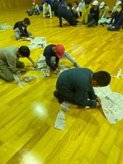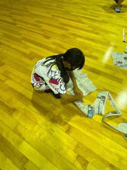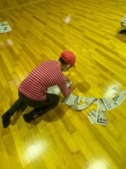 新聞紙を手でちぎってどこまで長くできるかを競っています!