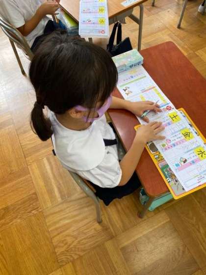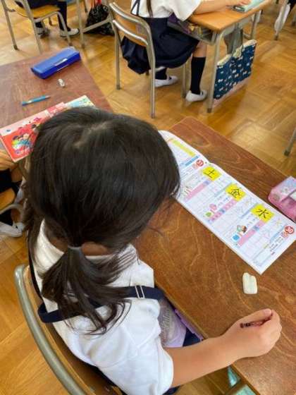 今日は、「水」「金」「土」の漢字を習いました。先生と、一緒にそれぞれの漢字を使って、文章を作りました。