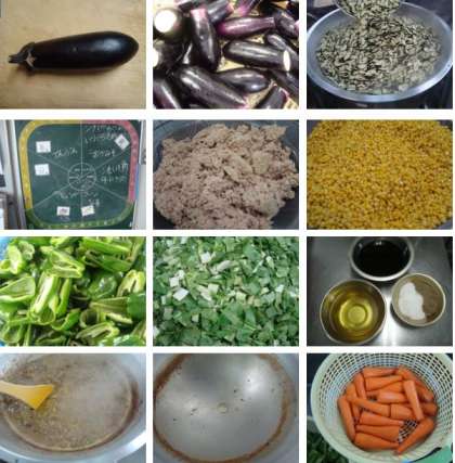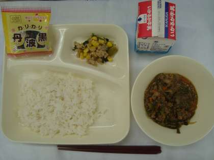「マーボーなす ツナとチンゲンサイのいためもの いり黒豆 ごはん 牛乳」