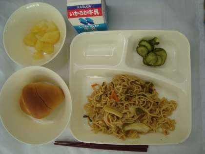「焼きそば きゅうりのしょうがづけ パイン(かんづめ) 黒糖パン 牛乳」