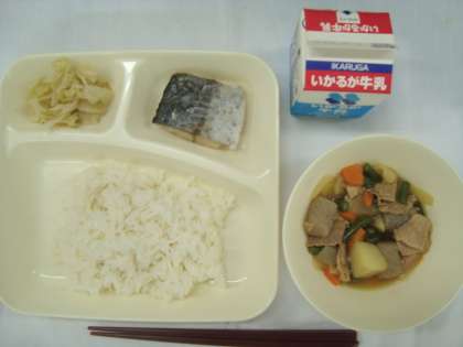 「さごしの塩やき 豚肉とじゃがいもの煮もの キャベツの梅風味 ごはん 牛乳」