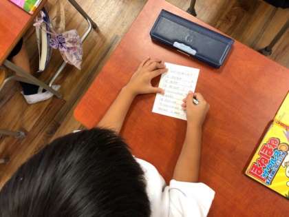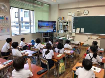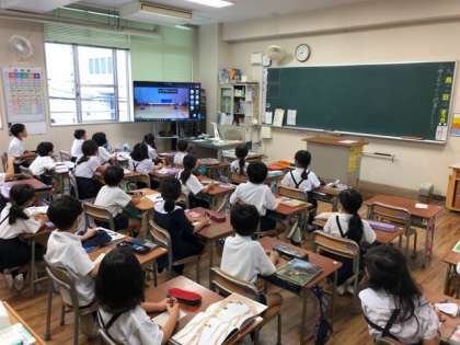 児童たちは、集会委員会が出したクイズを電子黒板で見て、答えていました。