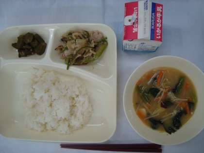 「豚肉の甘辛焼き みそ汁 オクラのおかかいため ごはん 牛乳」