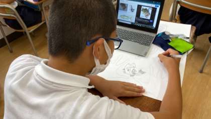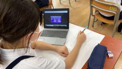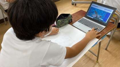 今日は、自画像と自画像の周りにお気に入りの魚を描きました。お気に入りの魚は、一人一台タブレット端末を使って、インターネットで調べて描いていました。