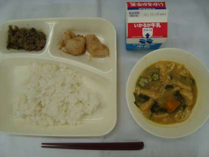 「焼き鳥 みそ汁 なすのそぼろいため ごはん 牛乳」