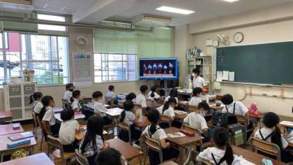 今日の児童集会は、健康委員会の発表でした。4年生から6年生が作った「目の体操」の動画を見ました。