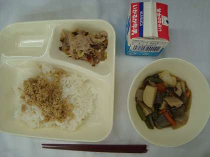 「豚肉のねぎじょうゆ焼き ふきよせ煮 ツナ大豆そぼろ ごはん 牛乳」
