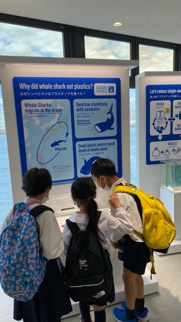 亡くなったジンベイザメのお腹で見つかったプラスチックゴミの展示を見ています。
