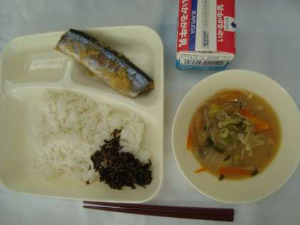 「さんまのみぞれかけ みそ汁 牛ひじきそぼろ ごはん 牛乳」