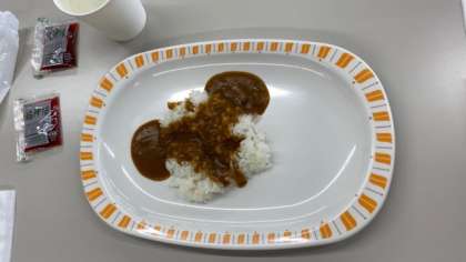 昼食の時間になりました。お昼ご飯はカレーです。カレーはお替り自由です。お替りは、チキンカレー、ビーフカレー、ポークカレーの3種類から選べます!