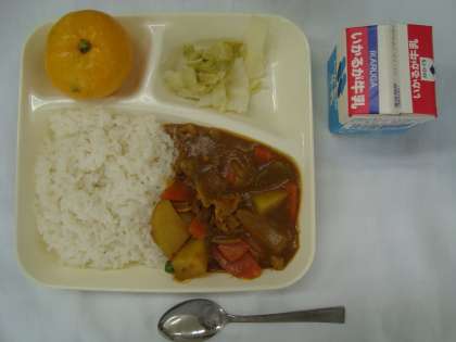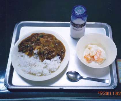 「ポークカレーライス(米粉) キャベツのピクルス みかん 牛乳」と「1993年の大阪市 カレーライス献立」カレーライスは、今も昔もかわりません。