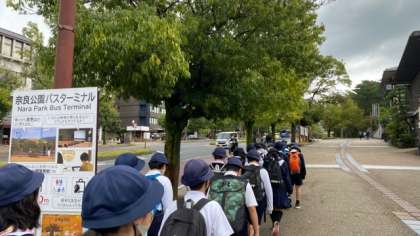 奈良公園に向けて歩いています。みんな、なかなか鹿に出会えず、ドキドキしています!