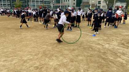 今日は、たてわり班でフラフープリレー行いました。1年生が6年生まで協力して、楽しめました。