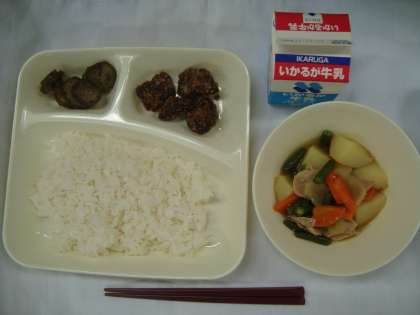 「くじらのたつたあげ 豚肉とじゃがいもの煮もの きゅうりの赤じそあえ ごはん 牛乳」