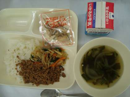 「ビビンバ わかめスープ アーモンドフィッシュ 牛乳」
