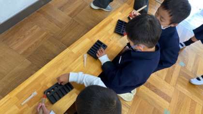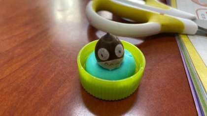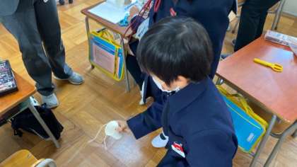 今日は、どんぐりを使って「どんぐりごま」や「けん玉」「どんぐり人形」を作りました。