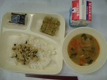 「お好み焼き 豚汁 とりなっ葉いため ごはん 牛乳」