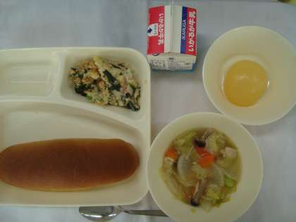 「スープ煮 ほうれん草のグラタン 白桃(缶詰) 黒糖パン 牛乳」