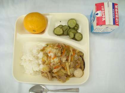 「中華丼(個別対応:うずら卵除去) きゅうりの中華あえ みかん 牛乳」