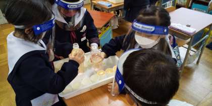 算数でペットボトルの水のかさを比べる学習をしました。コップに何杯分か、真剣に調べました。
