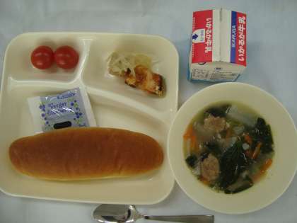 「さけのマリネ 肉だんごと麦のスープ プチトマト コッペパン ブルーベリージャム 牛乳」