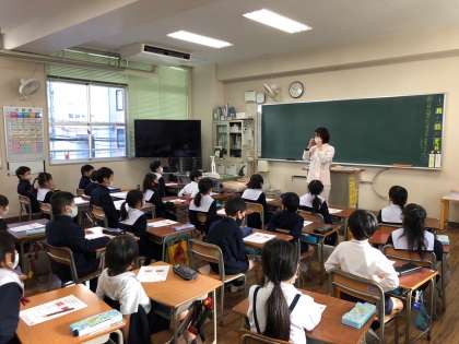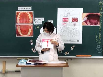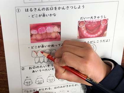 第一大きゅう歯が虫歯になりやすいこと、歯の間に歯垢が残りやすいことなどを学習した後、歯磨きの仕方を教えてもらいました。