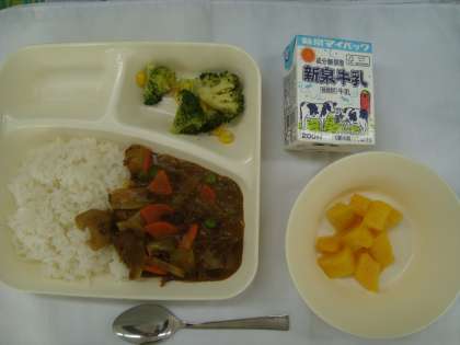 「冬野菜のカレーライス ブロッコリーとコーンのサラダ おうとうかんづめ 牛乳」
