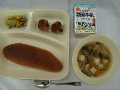 「あげシューマイ とうふのスープ ツナとチンゲンサイのいためもの 黒糖パン 牛乳」