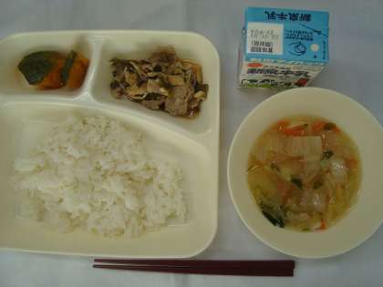 「豚肉と干しずいきのみそ煮 うすくず汁 焼きかぼちゃの甘みつかけ ごはん 牛乳」