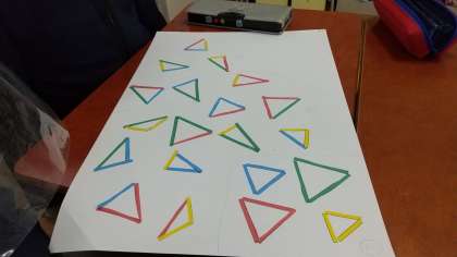 長さの違う4種類の紙を使って、いろいろな三角形を作りました。その後、辺の長さに目をつけて、三角形のなかま分けをしました。次時間は、なかま分けの根拠を発表し合い、二等辺三角形や正三角形という形の理解につなげます。