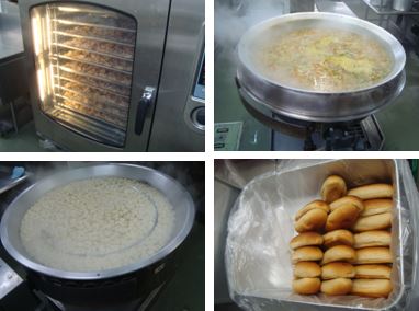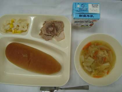 「豚肉のガーリック焼き スープ カリフラワーとコーンのサラダ 黒糖パン 牛乳」