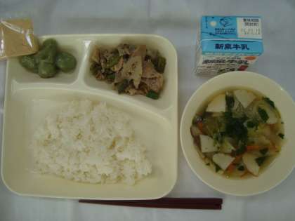 「豚肉とレンコンいため煮 五目汁 きなこよもぎだんご ごはん 牛乳」