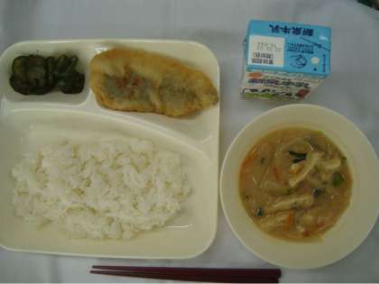 「いわしのフライ みそ汁 きゅうりの赤じそあえ ごはん 牛乳」