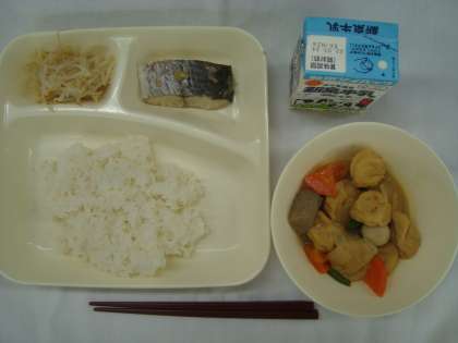 「さごしのおろしじょうゆかけ 一口がんもとさといものみそ煮 もやしのゆずの香あえ ごはん 牛乳」