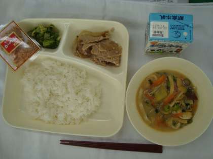 「豚肉のしょうが焼き さつまいものみそ汁 なのはなのおひたし ごはん 牛乳」